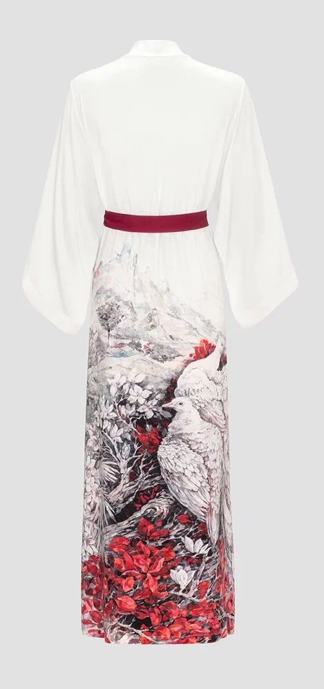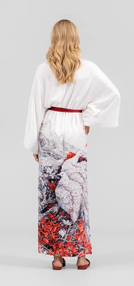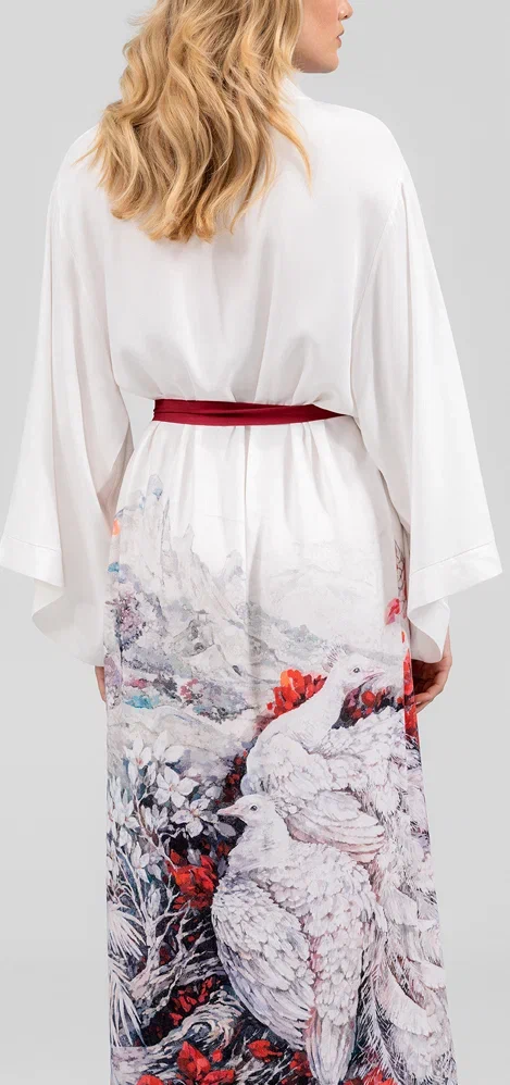 Tretirana je posebnim Kefalis rastvorom na bazi ekstrakta jonskih algi kako bi bila još mekša. Ovaj tretman čini tkaninu čvršćom i manje sklonom gužvanju. SENSOTEX® je prozračan, prijatan na dodir i pogodan za osobe sa osetljivom kožom. Dugi kimono iz Midaria kolekcije ukrašen je originalnim, namenski dizajniranim printom na donjem delu. Print podseća na umetničko delo – platno sa živopisnim orijentalnim motivima naslikanim uljem: beli paun, cvetovi magnolije i kontrastni crveni jesenji listovi. Beli gornji deo ističe se u odnosu na kontrastni, bogati rubin-crveni pojas. Tekstil Midaria kolekcije ispunjen je estetikom i zagonetnom lepotom Istočne Azije.