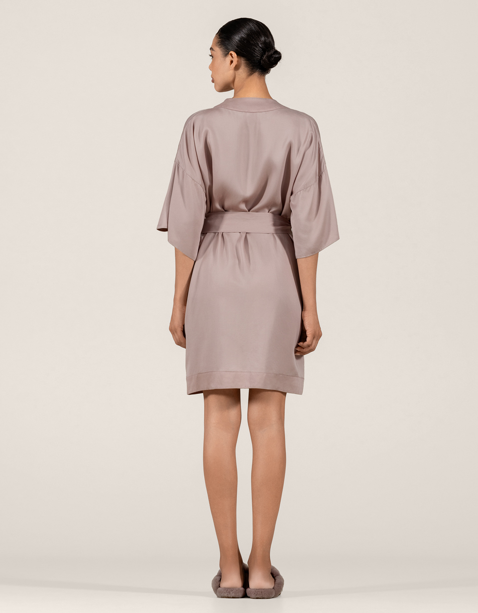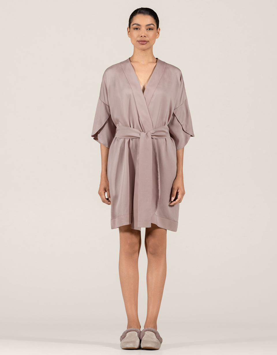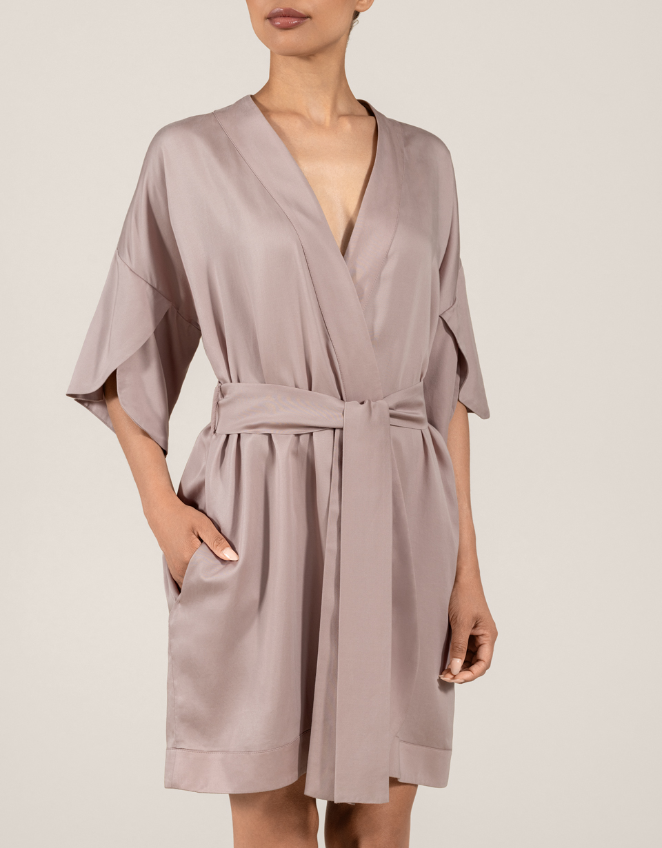 Ovo je prelep klasičan model laganog letnjeg ogrtača. Izuzetna mekoća i svilenkast osećaj modela „Naomi“ potiču od eukaliptusovog vlakna. Ova tkanina odlično upija vlagu, veoma je prijatna na dodir i pruža udobnost čak i tokom najtoplijih dana. Prefinjena nijansa pepeljasto ružičaste deluje elegantno i moderno. Ovaj prelepi kimono ima lepršave nabore i izgleda veoma ženstveno.