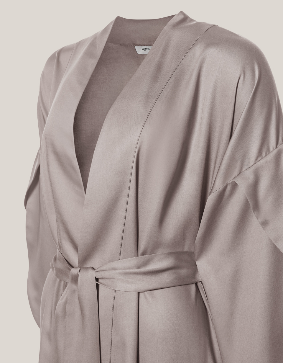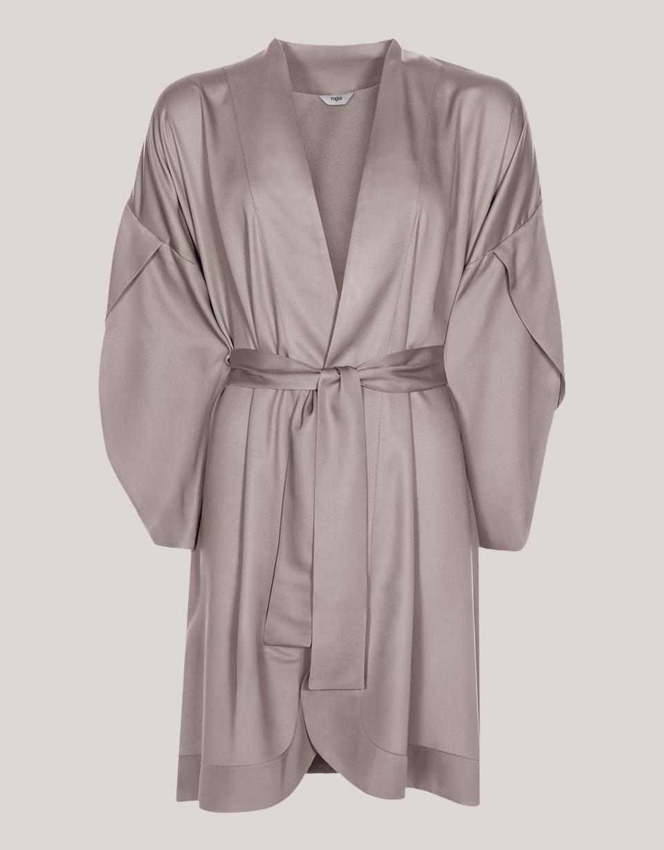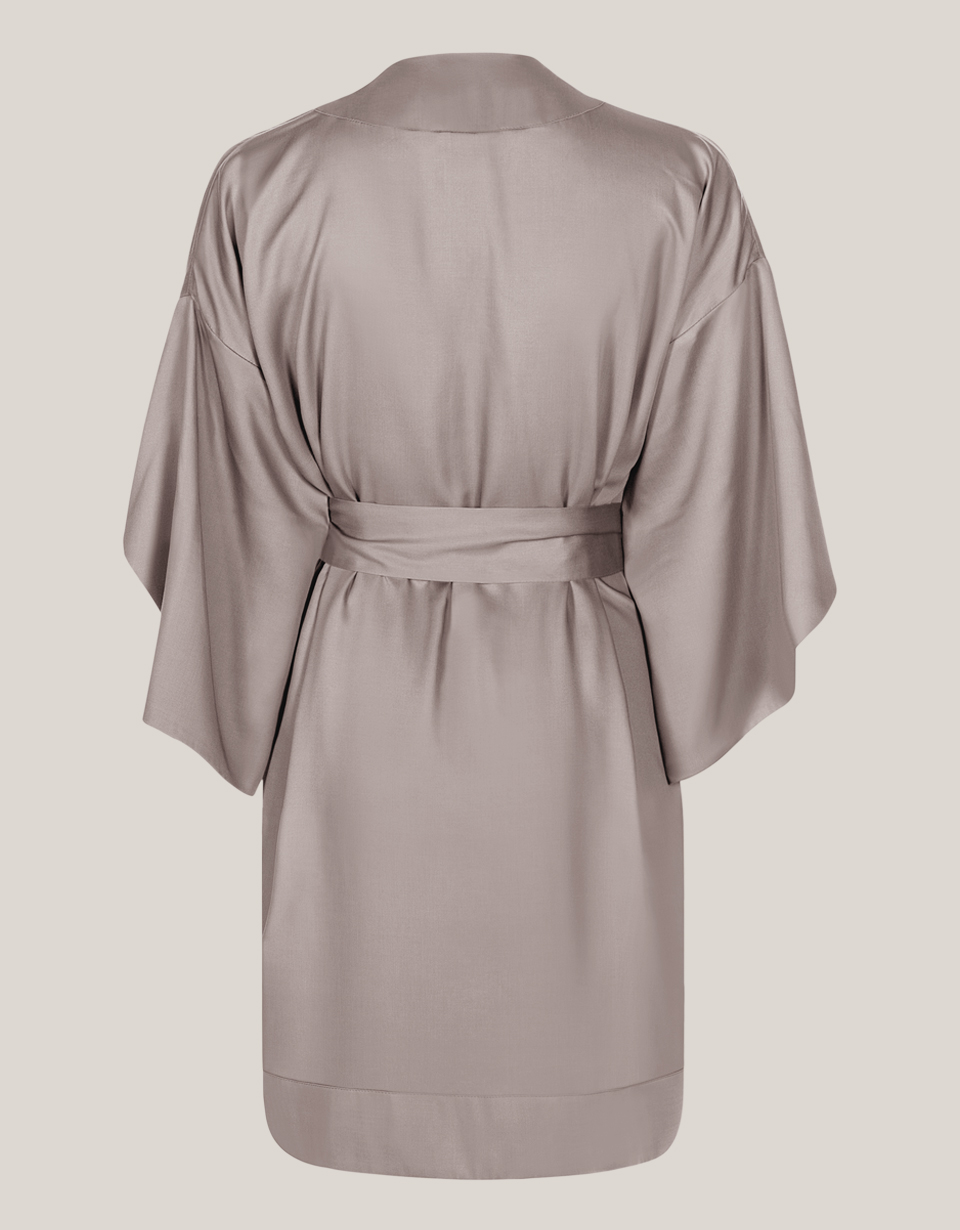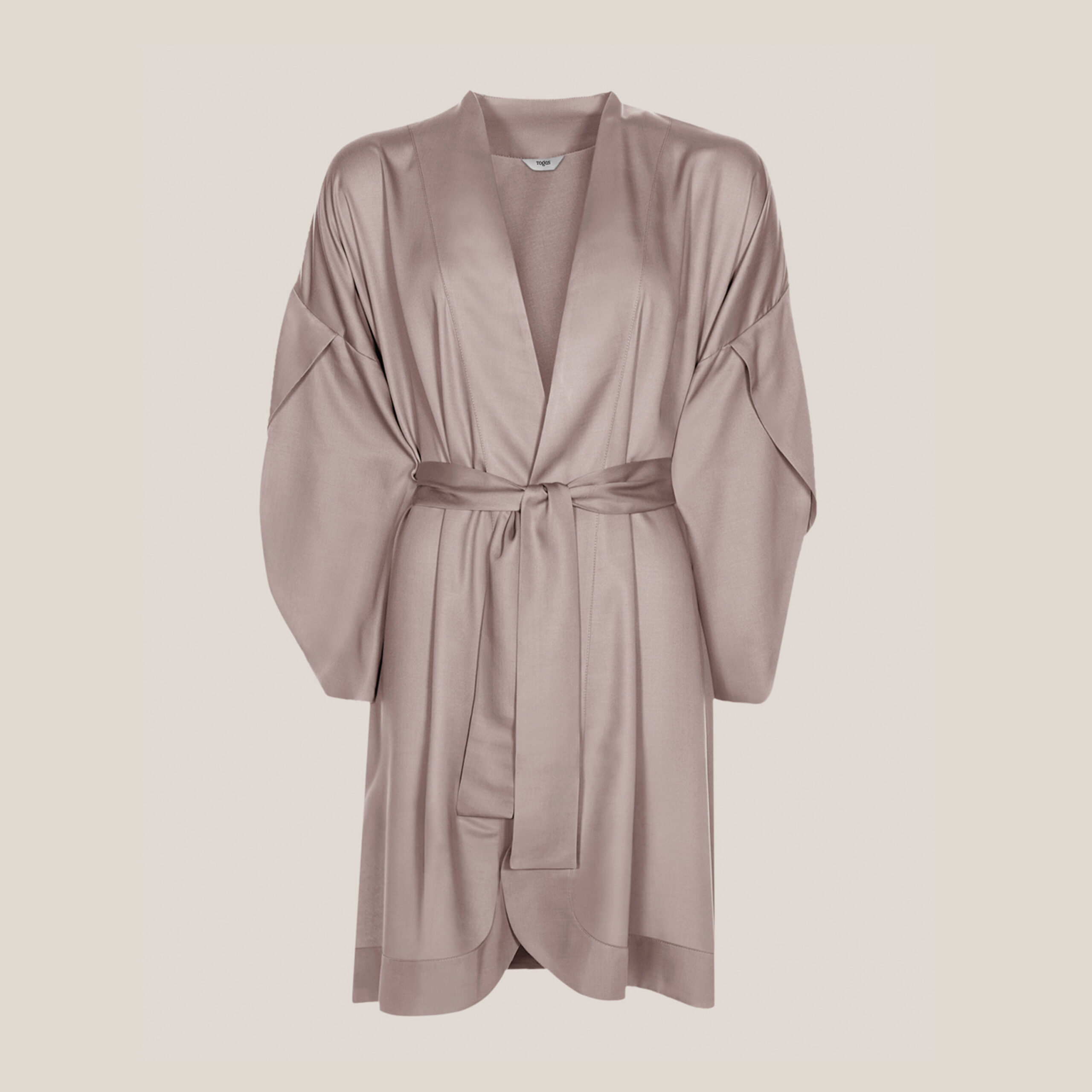 Ovo je prelep klasičan model laganog letnjeg ogrtača. Izuzetna mekoća i svilenkast osećaj modela „Naomi“ potiču od eukaliptusovog vlakna. Ova tkanina odlično upija vlagu, veoma je prijatna na dodir i pruža udobnost čak i tokom najtoplijih dana. Prefinjena nijansa pepeljasto ružičaste deluje elegantno i moderno. Ovaj prelepi kimono ima lepršave nabore i izgleda veoma ženstveno.