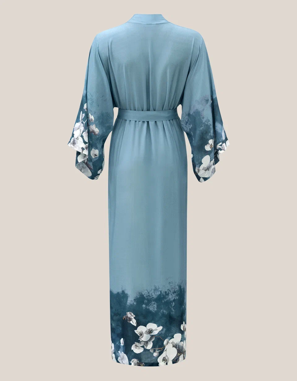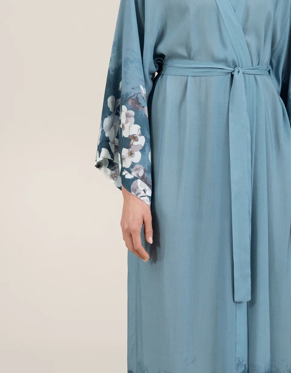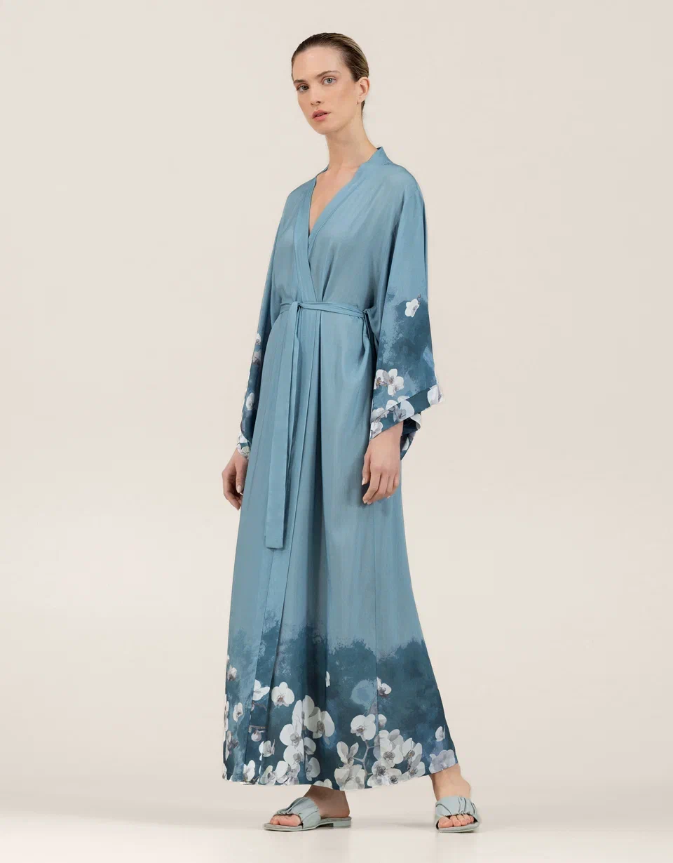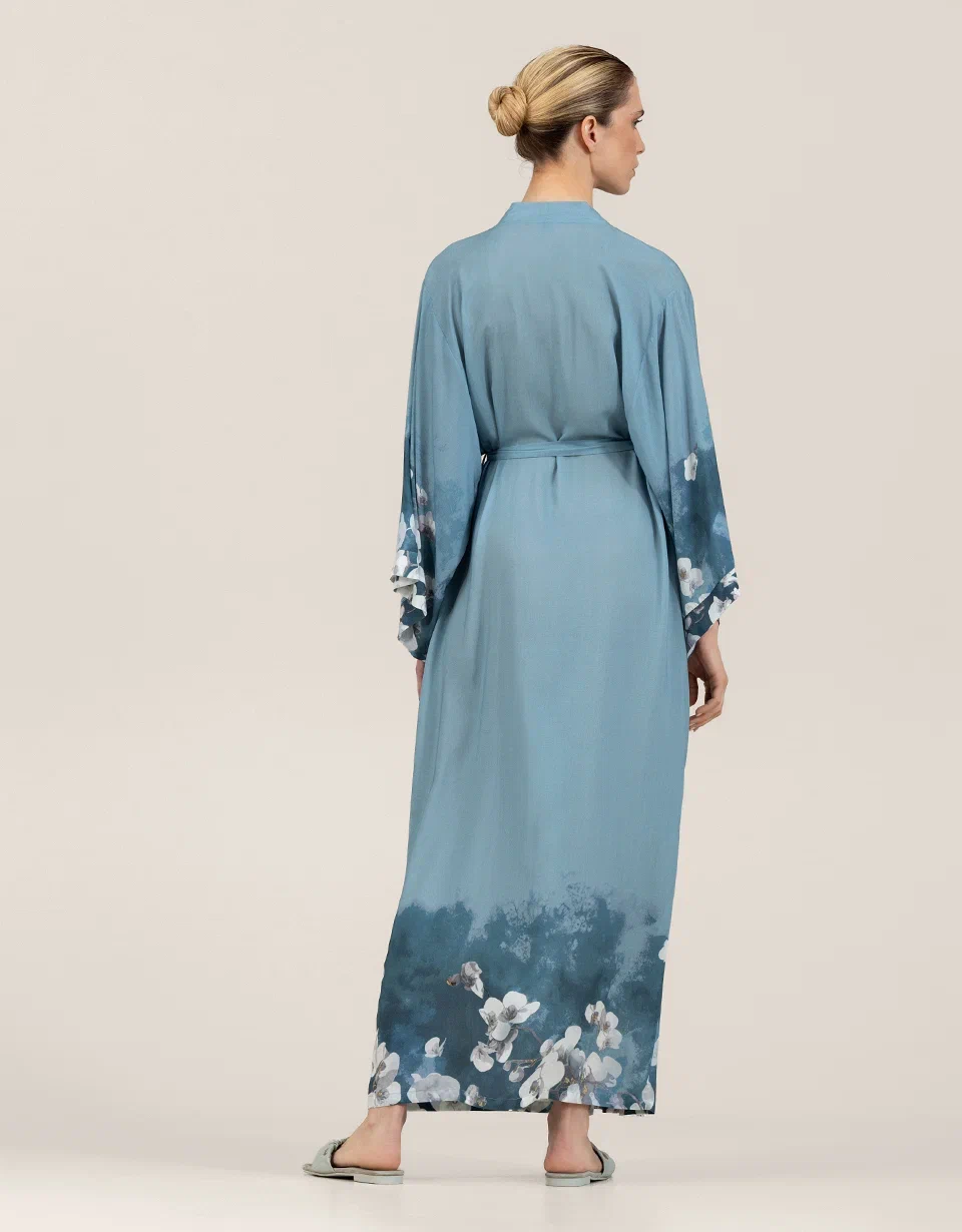 Rukavi i donji deo dugog kimona iz kolekcije Samoa ukrašeni su printom luksuznih belih kraljevskih orhideja. Bela kraljevska orhideja predstavlja plemenitost i besprekornost svakog latica. Tirkizna pozadina materijala naglašava belinu cveta. Delikatno akvarelno razlivanje čini ga sofisticiranijim, dodaje dozu zadimljenosti i polutonova. Ovaj ženstveni model privlači pažnju svojim nijansama i prelepim tropskim bojama.