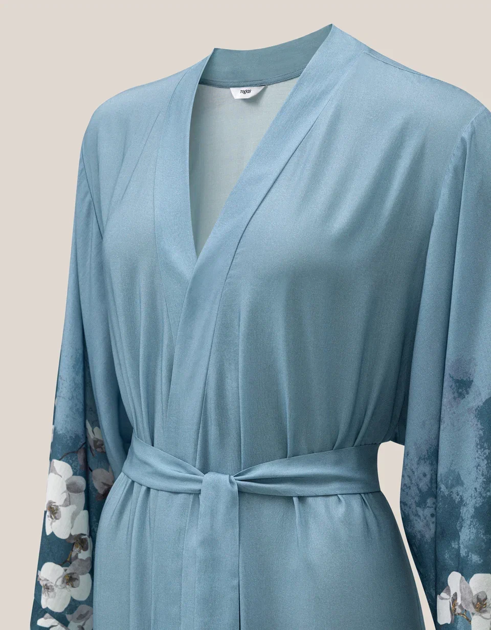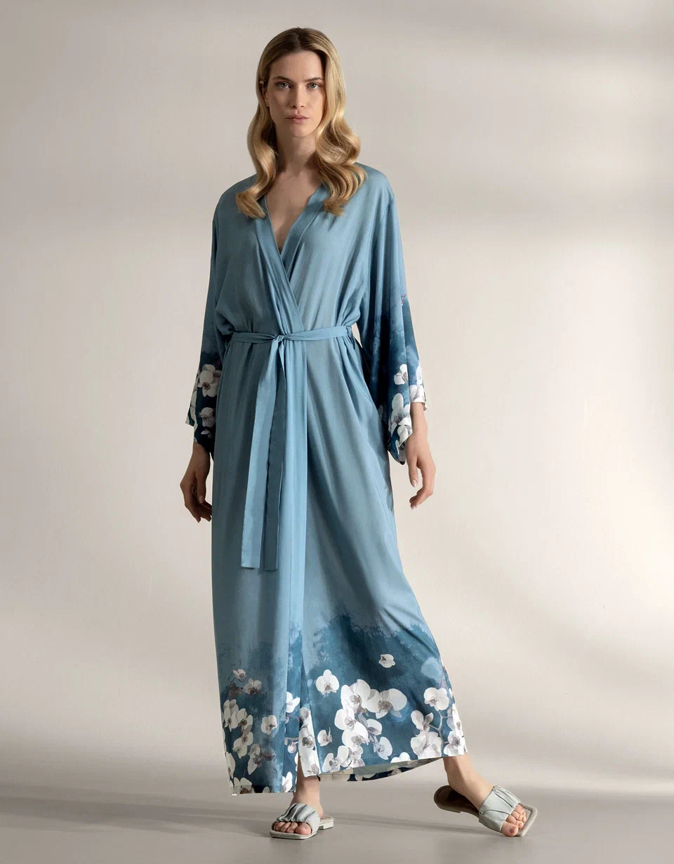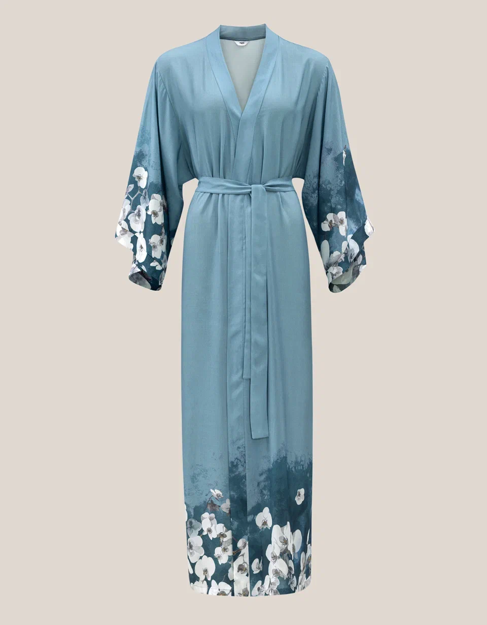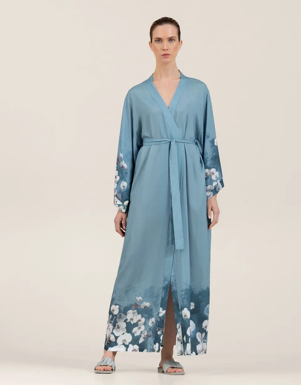 Rukavi i donji deo dugog kimona iz kolekcije Samoa ukrašeni su printom luksuznih belih kraljevskih orhideja. Bela kraljevska orhideja predstavlja plemenitost i besprekornost svakog latica. Tirkizna pozadina materijala naglašava belinu cveta. Delikatno akvarelno razlivanje čini ga sofisticiranijim, dodaje dozu zadimljenosti i polutonova. Ovaj ženstveni model privlači pažnju svojim nijansama i prelepim tropskim bojama.