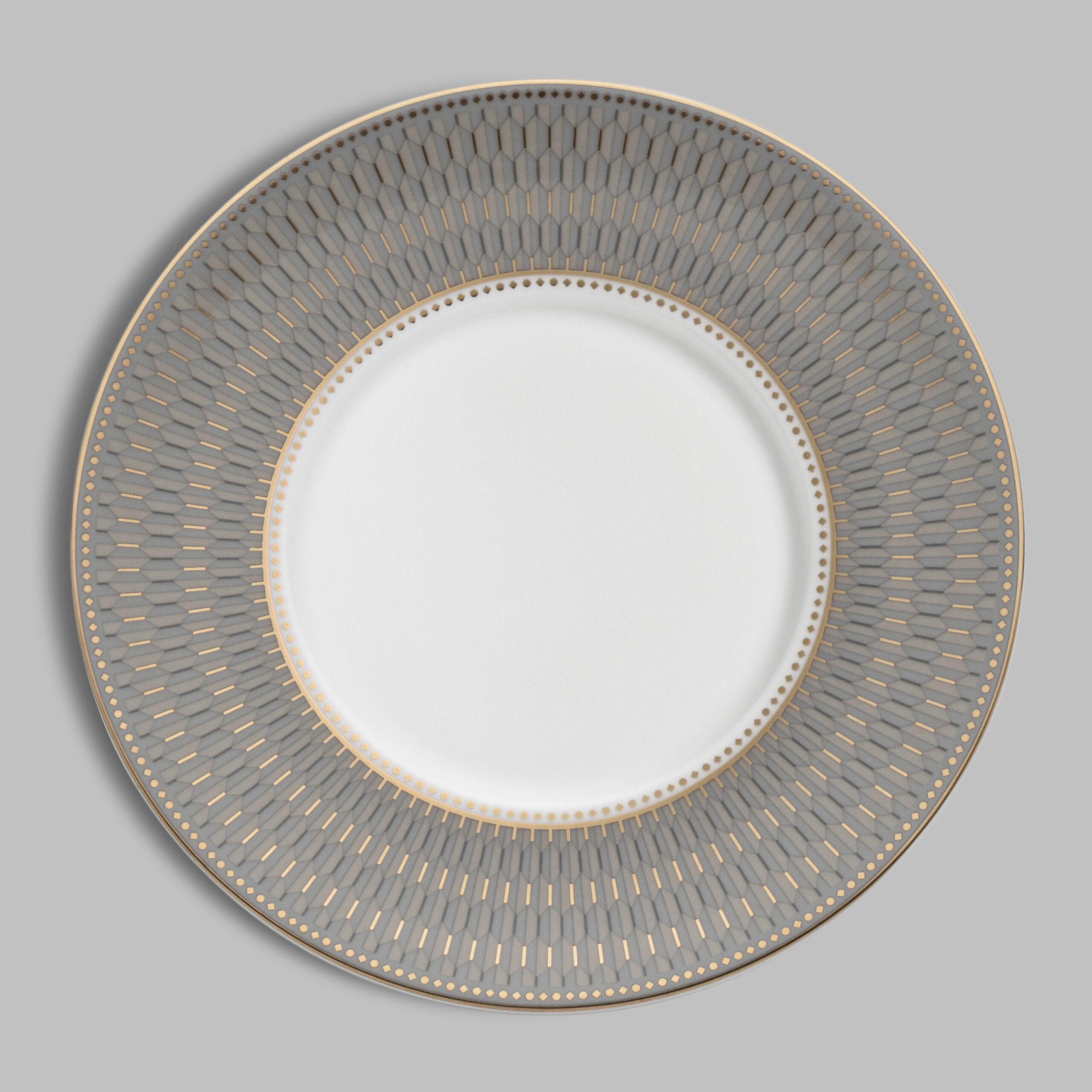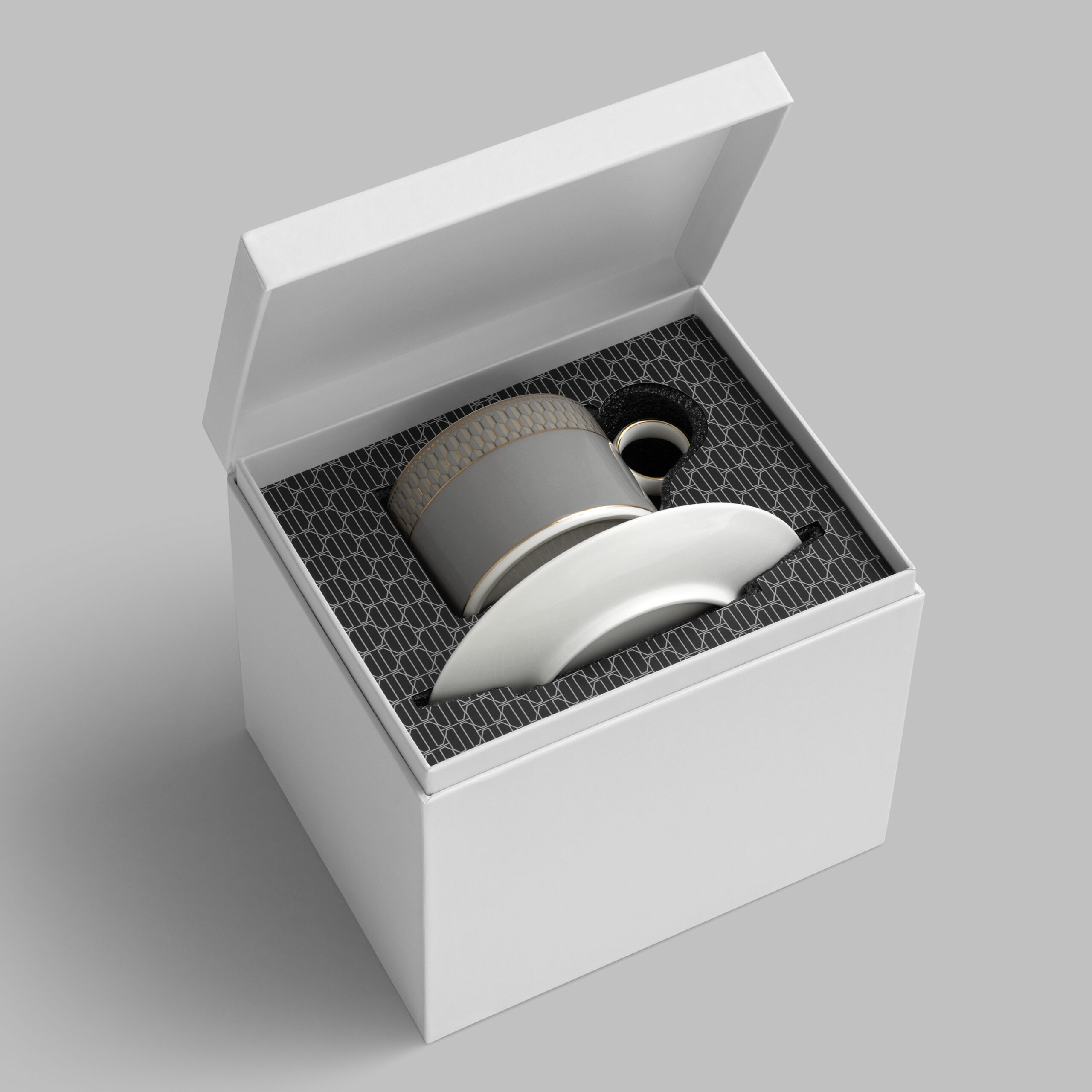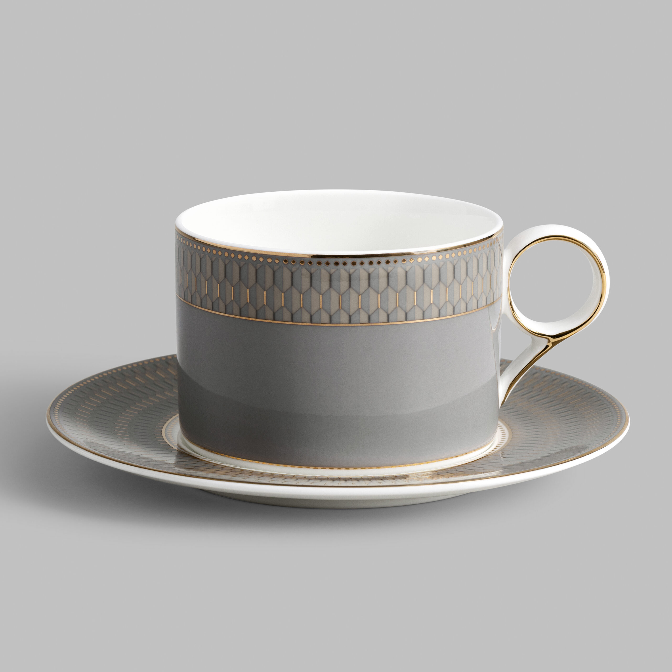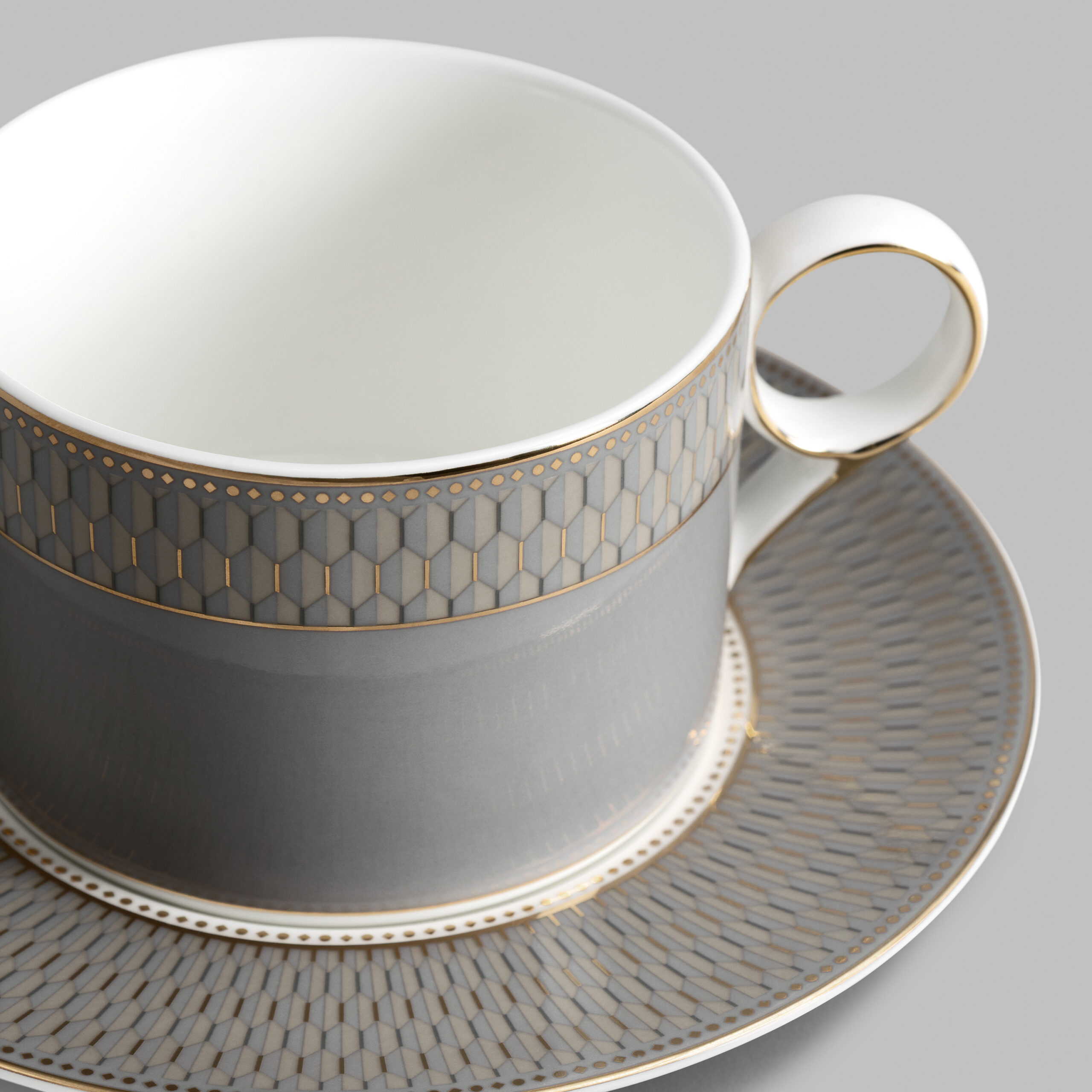 Dimno-siva šoljica ukrašena je složenim geometrijskim Art Deco motivom i elegantnom ručkom u obliku prstena. Ista dekoracija okružuje tacnu, naglašavajući besprekorno bel porcelan. Ovaj elegantan ornament privlači pažnju složenom geometrijom u sivim tonovima sa nežnim zlatnim detaljima. Set će oplemeniti svaku čajanku i savršeno se uklapa sa čajnikom i bombonjerom „Harlyn“.